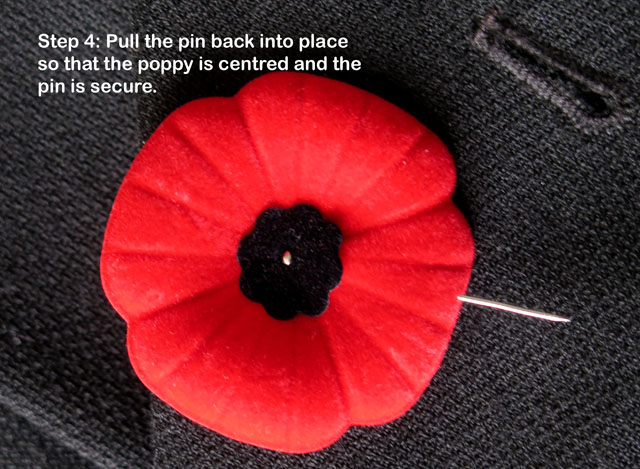 It's a good idea to think about location and direction. The poppy is generally placed over the heart if worn on the chest. You want the point of the pin to be pointing away from your body - so it doesn't stick you by accident.
